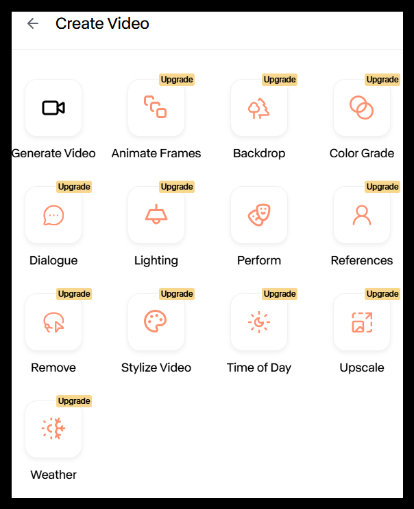 When you open Runway’s Create Video panel, you see a whole toolbox for building or editing videos. Think of each icon as a separate “skill” the AI has — you pick the skill you need, give instructions, and the model handles the rest.